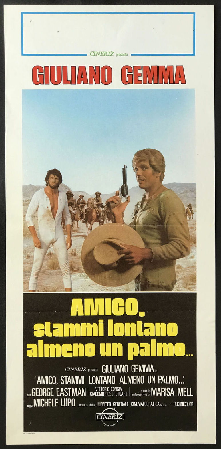 Titre original: Amico, stammi lontano almeno un palmo... - Paese di produzione: Italie - Année: 1972 - Durée: 110 min - Genre: western, comédie - réalisation: Michele Lupo - Histoire: Luigi Montefiori - Scénario: Sergio Donati, Luigi Montefiori - Maison de production: Jupiter Generale Cinematografica - Distribution (Italie): Titanus - Photographie: Aristide Massaccesi - Montage: Antonietta Zita - Musique: Gianni Ferrio - Scénographie: Dario Micheli - Costumes: Elio Micheli - Trucages: Walter Cossu...